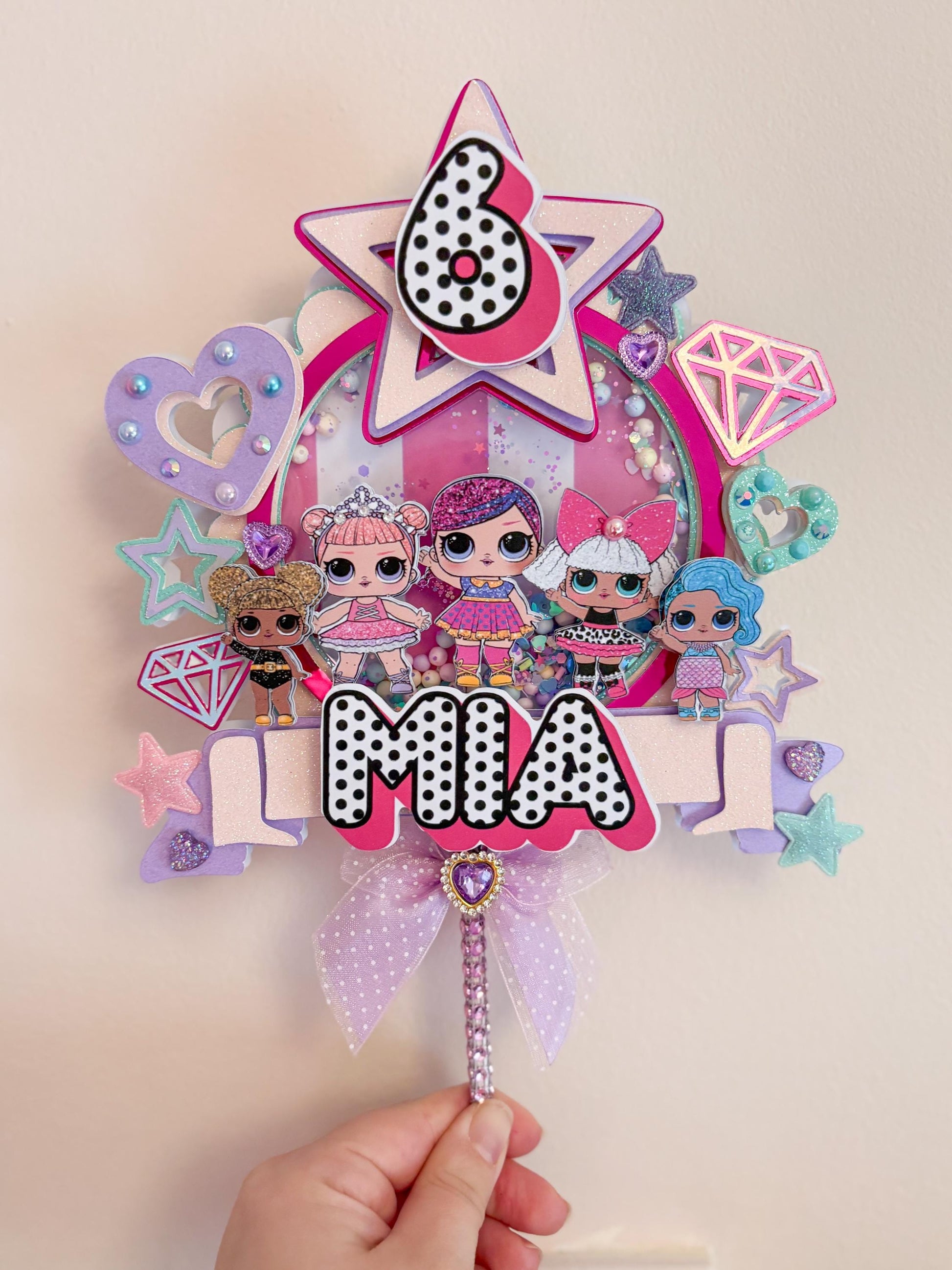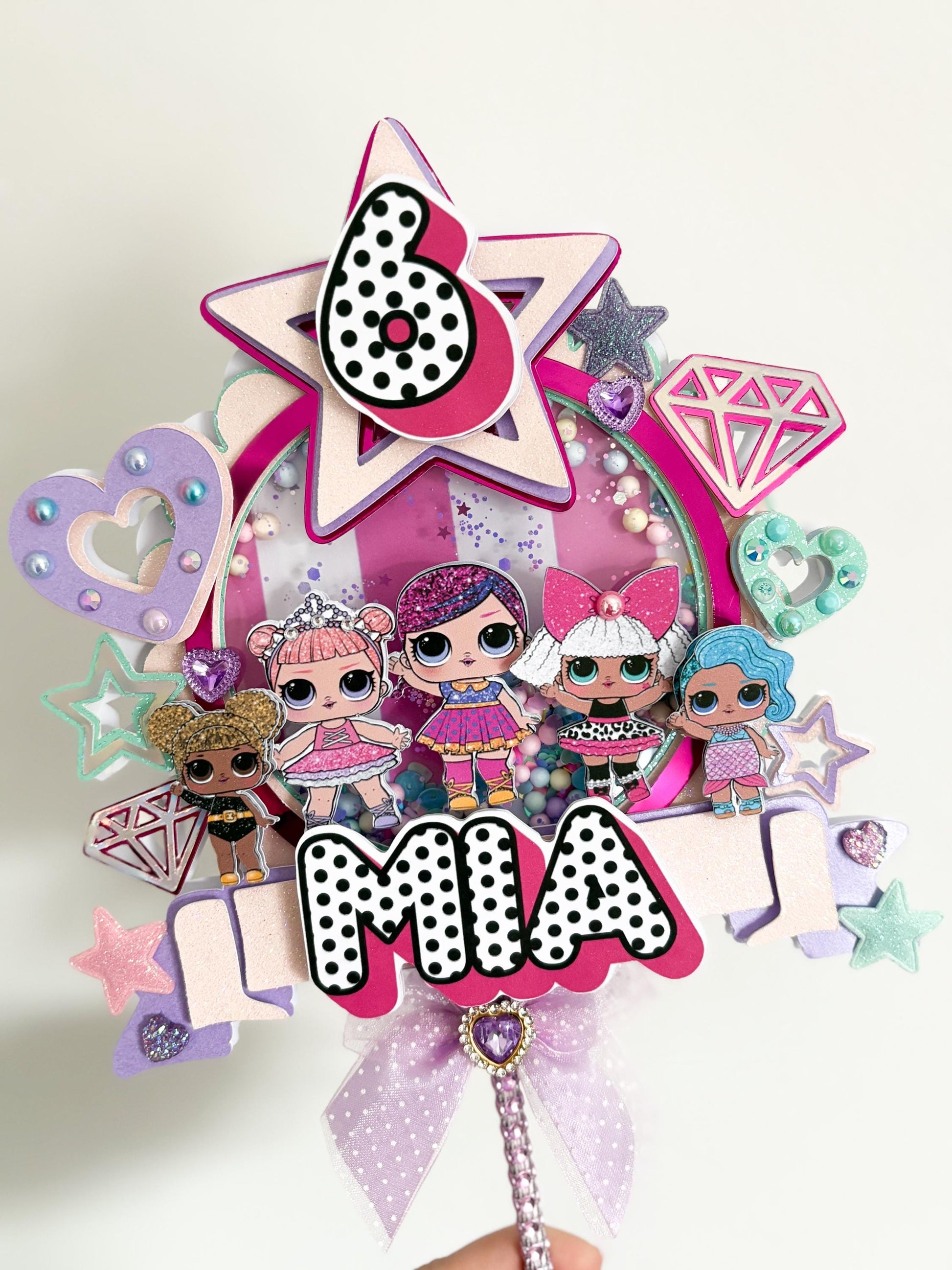 Shaker style cake topper filled with sequins and glitter. It is then built up with high quality cardstocks to make a 3d effect which adds the extra ‘wow factor’. After the cake topper has been used you can remove the stick and keep the topper as a lovely keepsake. Many of my customers have contacted me since ordering to say they’ve done this!