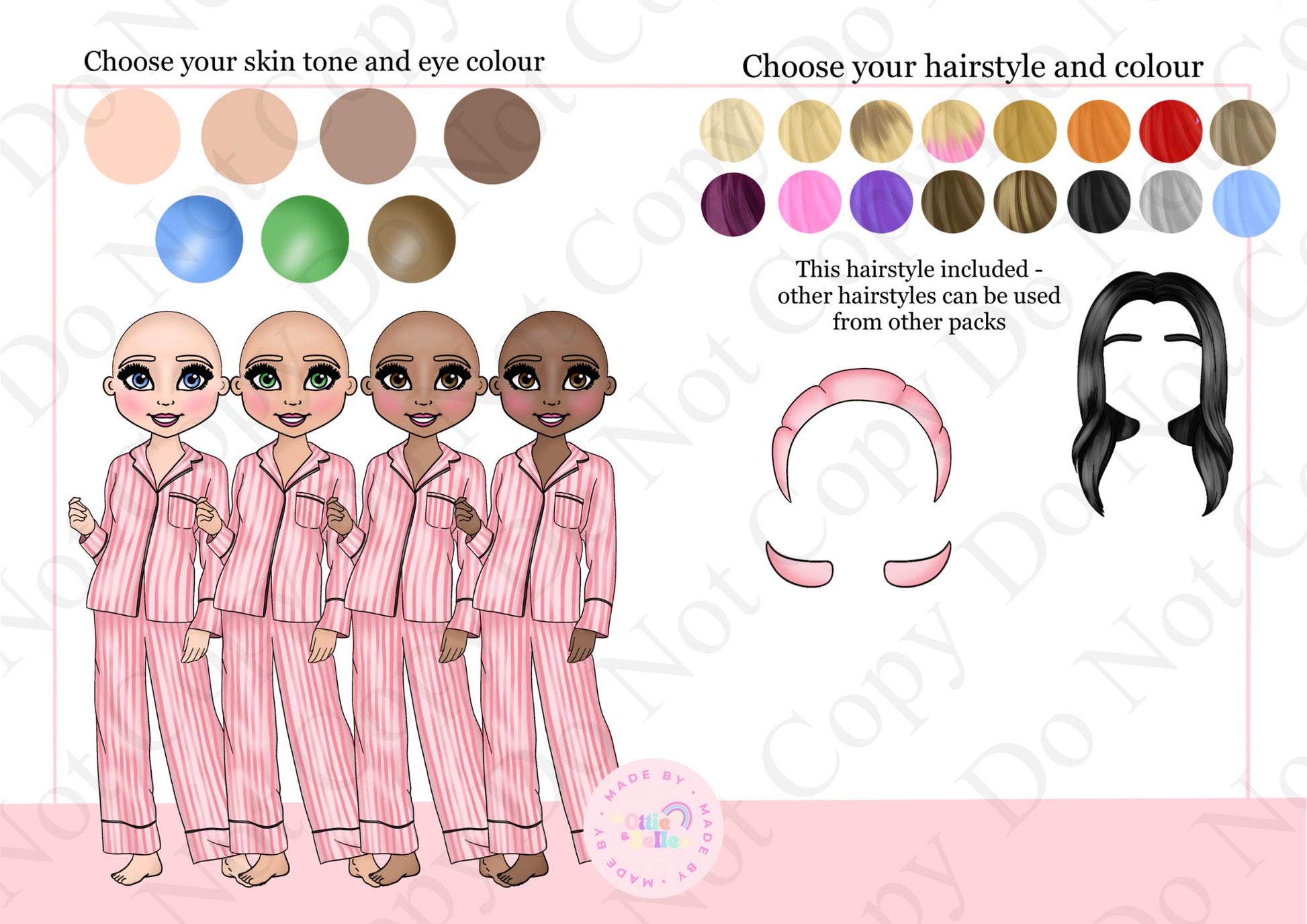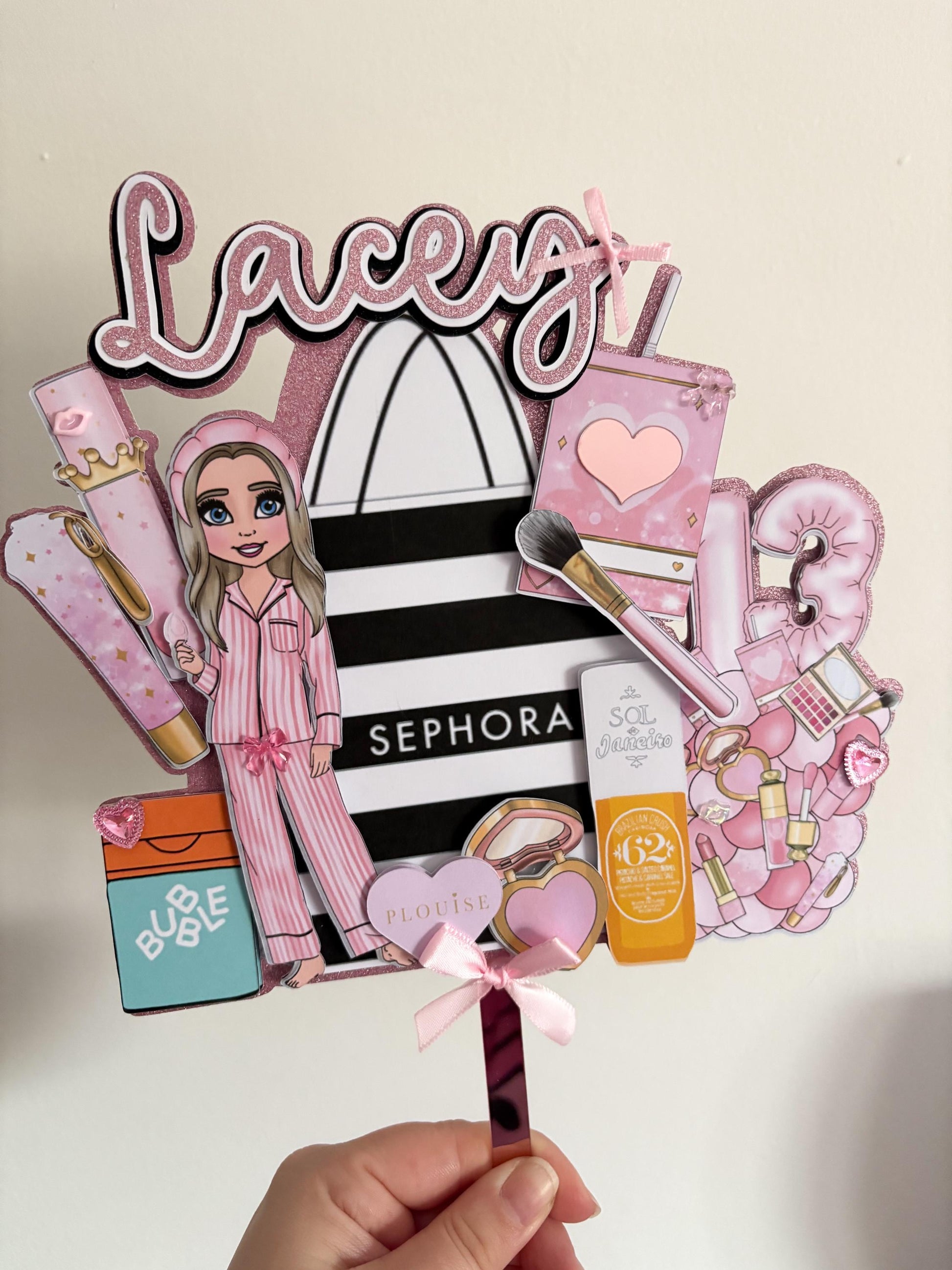 Cake toppers are personalised with a name and age of your choice. You can also personalise the dolly on the side to match the recipient. Please choose the skin/hair and eye colour from the choice sheet and write this in the personalisation box. (You can choose to add eye masks) The design comes with the makeup options shown but you can choose additional makeup products if you wish.