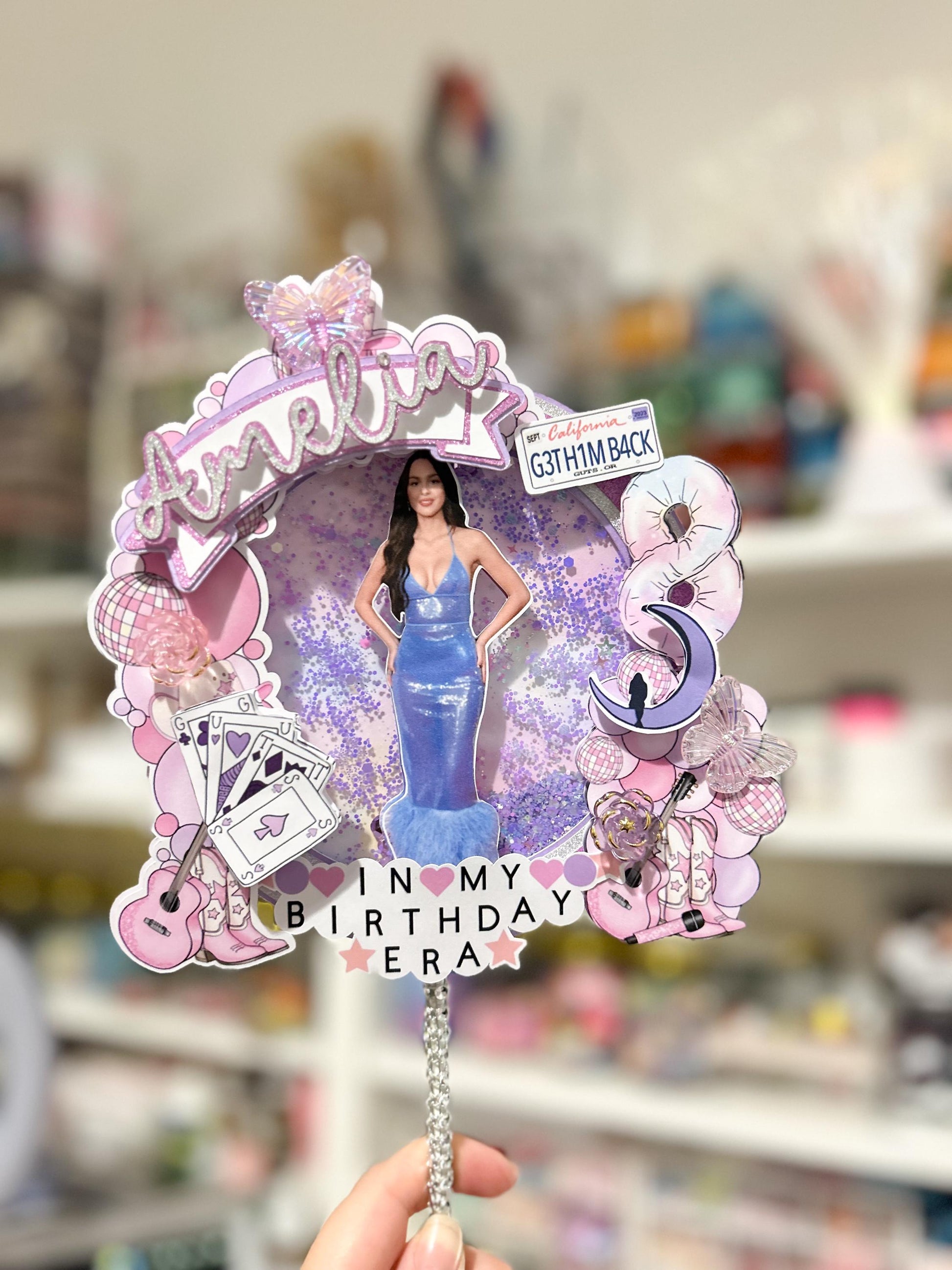 Shaker style cake topper filled with sequins and glitter. It is then built up with high quality cardstocks to make a 3d effect which adds the extra ‘wow factor’. After the cake topper has been used you can remove the stick and keep the topper as a lovely keepsake. Many of my customers have contacted me since ordering to say they’ve done this!